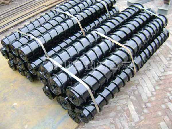 螺旋托輥主要用來清理粘附在膠帶上的雜物,并可以起到 調偏作用。結構形式為,普通托輥上面焊接直徑為10至14毫米的左右螺旋圓鋼或者在外表面加上一個螺旋槽鑄膠套來增加整個托輥的,可以 清理膠帶上的粘附物,切實帶式輸送機膠帶的使用壽命,而且還起著調心防跑偏作用。