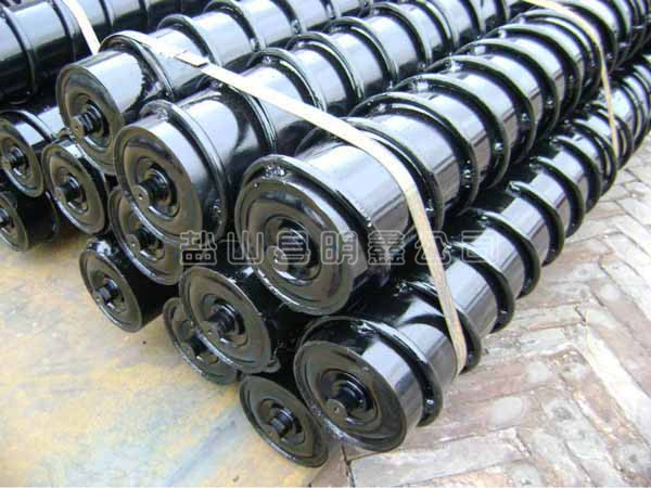 螺旋托輥防止跑偏的原理是:托輥組中兩個側托輥均為帶有錐度的螺旋托輥,但螺紋的旋向不同,一側托輥為左旋,另一側托輥為右旋,這樣給予輸送帶的橫向力才都指向 線。當輸送帶運行時,由于螺旋的作用,分別產生軸向力。跑偏時,輸送帶向一邊滑動,受到螺旋角產生的向帶 的推力,越向外邊越大,此時,兩托輥產生推輸送帶向 的力不等,這兩個力的差值將促使輸送帶復位。螺旋托輥安裝在輸送帶上時,中間托輥的螺旋應為雙向的,即一頭為左螺旋,另一頭為右螺旋。兩側托輥一側為左旋螺紋,另一側為右旋螺紋。安裝螺旋托輥的要領是,可面對輸送機機尾,則右手邊安裝右旋螺紋托輥,左手邊安裝左旋螺紋托輥。